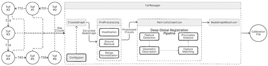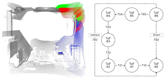 The presented system uses ToF cameras positioned in a circular arrangement in clockwise or counterclockwise order, with overlapping fields of view between adjacent cameras to achieve surround-view spatial coverage of the environment. The layout can be modeled as a directed graph as shown in Figure 5, where the nodes represent individual cameras, each working within a local coordinate system, and the edges encode the rigid transformations required to align neighboring pointcloud pairs.