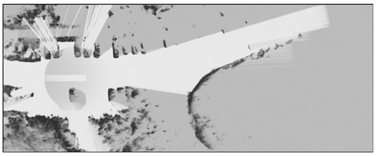 The registration process described in Section 3.3 is used to determine the sensor’s relative orientation and generate combined point clouds. OGM is then updated by the measurements obtained from all sensors. The base for grid map representation framework introduced in [70] is used, which allows creation of multiple layers of grids. One of these layers is used to store the 2D occupancy values, while multiple other layers are used to store intermediate values. A cell size of 10 cm is chosen, which represents a good balance between memory requirements and environmental representation granularity. In this work, the OGM update is split in two parts, but prior to the update, measurements are filtered to remove points which are of no threat to the vehicle (those higher than the vehicle or lower than the acceptable height relative to vehicle tires). After such filtering, any occupied cell can be considered an obstacle regardless of its height, and the environment can be represented in 2D. Then, all cells containing measurements have their occupancy probability increased by a binary Bayes filter update and their positions marked in an intermediate layer. A decrease in occupancy probability is achieved with the same filter update, but the cell selection is different. Ray tracing is used to traverse cells up to each measurement point. At each cell, during this traverse, the cell index is cross-checked with the intermediate layer, which contains all cells that had their occupancy increased in this iteration. If a match is found, the current ray is terminated without updating the cell’s value and the next one is started. This solves the issue of marking cells as free (in 2D space) behind occupied cells or reduction of occupancy probability for cells containing measurements by consecutive rays passing above or below said cell in 3D space. This update process is repeated at each iteration (time step) for each sensor when new sensor measurement data are received.