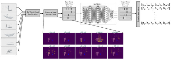 The pipeline for our custom 3D spiking convolutional neural network (3D-SCNN) depicted in Figure 8 involves spatiotemporally sparse ToF signal processing with convolutional SNN algorithms. The resulting point-cloud processing pipeline performs efficient information transmission and processing, overcoming conventional processing limitations on graphical processors (GPUs). To facilitate non-rate-based spike encoding, the temporal voxel coding (TVC) preprocessing step applies latency encoding on multiple ToF camera outputs, combining them into a single, coherent data frame. This time-domain spike encoding improves information sparsity retention, which can be leveraged for processing efficiency with specialized neuromorphic neural processing units (NPUs), such as the Brainchip Akida [72] or custom FPGA accelerators.