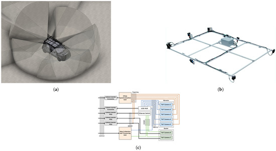 Two types of ToF sensors were used in the 360° perception system to achieve a predetermined data rate in frames per second (FPS). Their key characteristics can be seen in Table 1. During the measurement, when choosing between the quality of the obtained data, frame rate, and sensing range, the MODE_9_10FPS_720 configuration was selected as the optimal mode for the Pmd Pico Monstar [73] sensors. The Basler Blaze 101 [74] sensors, which offer more flexible configuration options, were adjusted to match these settings as closely as possible. Both sensors have different advantages and limitations. The Monstar sensors provide a wider FoV but have a shorter range and operate at 850 nm part of the spectrum, which is more affected by sunlight interference. In contrast, the Blaze 101 sensor has a longer sensing range and operates at 940 nm, which corresponds to a spectral dip in solar radiation, reducing interference. However, it has a narrower FoV. These trade-offs were considered when assembling the system to balance coverage, range, and robustness against interference.