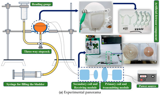 The TET system includes an external primary coil and a transmission module (composed of a control module, opto-isolation circuit, drive circuit, inverter circuit, and absorption buffer circuit), as well as a secondary coil and a receiving module (composed of a secondary coil compensation topology and rectification, filtering, and voltage regulation circuits). The specific execution procedure may be broadly summarized as follows: utilizing a syringe to gently inject water into a simulated bladder to replicate the process of human bladder filling, with a total injection volume of 300 mL (the usual bladder capacity of an adult is around 300–500 mL). The external transmission module transforms the DC power into AC power with a frequency of 281 kHz after the injection is finished, and the three-way valve’s injection side is closed. The AC power is then sent to the primary coil and its compensation topology circuit. Through the alternating magnetic field between the primary coil and the secondary coil, electrical energy can be transmitted to the secondary coil within the body and its compensation topology circuit. After rectification, filtering, and voltage regulation by the internal receiving module, it can provide a continuous and stable power supply for the artificial detrusor. The SMA spring fitted on the artificial detrusor prosthesis undergoes a phase change and heats up under electrical excitation, generating a restoring force that causes it to contract. Under the influence of this restoring force, the prosthesis rotates inward around the support frame, “closing” and compressing the bladder, providing the necessary pressure for bladder urination. As the pressure gradually increases, the liquid level in the syringe on the upper left rises, allowing the volume of the expelled liquid to be read. The diagram of the driving process of the artificial detrusor is shown in Figure 28.