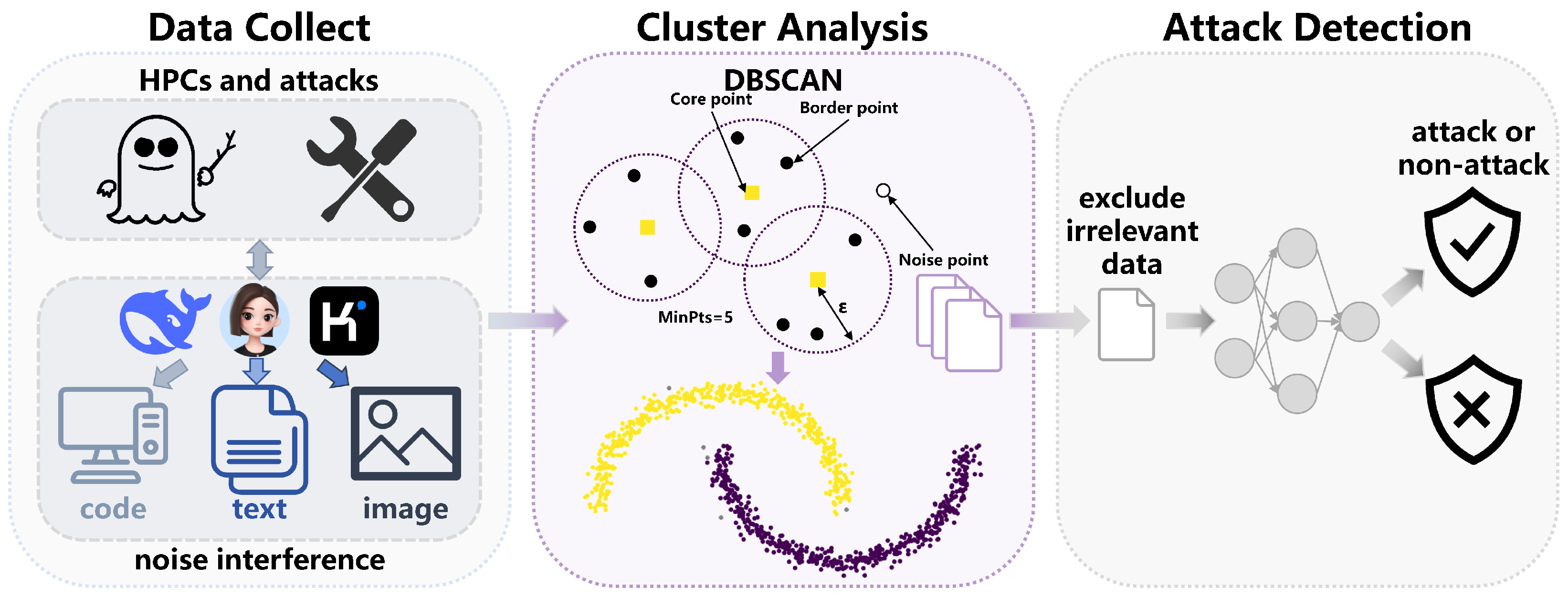 The purpose of employing cluster algorithms is to select representative samples from the HPCs data, thereby reducing the size of the dataset. (1) The evasive Spectre attacks captured when the LLMs accesses text, images, and code may have abnormal or irrelevant values. DBSCAN is able to effectively identify the noise, and then clear these noises rather than forcibly assigning the noise to a certain cluster. (2) DBSCAN can leverage the captured data structure to more accurately identify representative samples. Moreover, the core parameters of DBSCAN, such as the neighborhood radius (Eps) and the minimum number of samples (minPts), can be flexibly adjusted based on data characteristics. This allows for the identification of the most suitable parameter combinations for detecting evasive Spectre attacks in data collected when LLMs access text, images, and code, respectively. (3) Evasive Spectre attacks may exhibit non-linear feature distributions when accessing text, images, and code. By defining clusters through density connectivity rather than through rigid distance thresholds, DBSCAN can effectively identify attack patterns with complex structures and prevent the loss of critical attack features.