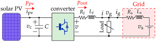 Figure 1 shows the power circuit (plant) of the study system. The numerical values are given in Table 1. A set of PV panels is connected to a DC grid through a power electronic converter (PEC). The PEC is a standard full-bridge voltage-source converter (VSC) with the source-side (or PV-side) capacitor (C), and the output-side (or grid-side) filter (). The grid is modeled by a voltage source () behind an impedance ( and ), which is a common way of modeling a practical grid based on Thevinin’s theorem of circuit theory. The larger values of these impedances indicate weaker grid terminals. The grid side terminal voltage, i.e., at the point of common coupling (PCC), is denoted by . The small resistor models the on-state resistance of the converter switches and the parasitic resistance of the output inductor (). The capacitor voltage and its reference value are denoted by and , respectively.