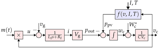 where is the power injected to the grid assuming that the converter losses and interfacing filter instantaneous power are neglected, and is the derivative of the capacitor energy. Using the Taylor series, the relationship between the capacitor energy and its voltage can be approximated as , where capital letters indicate the rated values and lowercase variables represent the instantaneous values. These lead to the block diagram model shown in Figure 2. In this model, is the converter modulation signal. In this diagram, the PV panels are modeled as a power source , where I is the solar irradiance and T is the temperature. The function f is the power-voltage characteristics of the PV panels, which is a nonlinear function. Explicitly engaging this function in modeling and analysis complicates the process. Therefore, in this study, the PV power is treated as a disturbance to the control system. A robustly designed control system will be able to tolerate its variations, as shown in this paper.