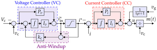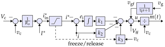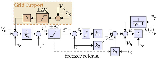 The basic structure of proposed controller is shown in Figure 3. Its components and their differences with the conventional controller, shown in Figure 4, are described below. (1) The voltage controller is a simple gain . The constant value is equal to the rated current. The conventional approach uses a PI compensator in the VC loop. (2) The current controller comprises an additional feedback from the capacitor voltage that makes the controller a full-state feedback, allowing optimal control designs with enhanced flexibility and performance robustness. (3) The feed-forward terms and are utilized for the soft start, and also improves the current-limiting feature. (4) The linearity of the loop is increased using the input linearization term that divides u to . (5) The current-limiting is performed by a saturation block and a freeze/release mechanism [17], unlike the conventional controller, which requires an anti-windup technique. (6) The grid voltage support properties are added and explained in Section 3.2.