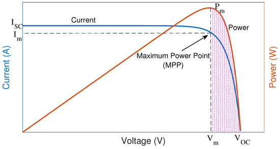 In an MPPT-based system, the PV voltage is adjusted to track the MPP, ensuring that the power output is maximized at all times. The power generation under MPPT can be described as a function of the voltage at the maximum power point, i.e., . However, in the proposed control approach, the PV voltage is allowed to deviate from the MPP in a controlled manner to provide grid voltage support. The power curtailment due to this offset can be quantified as follows: