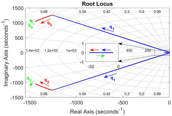 Trajectory of closed-loop poles for the controller design when (blue), (red), (green) change from to , to , and to , respectively.