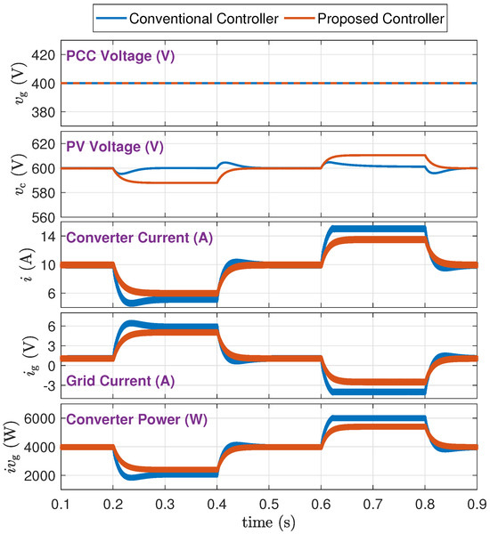 Case I [Local Load Disturbances]: Figure 20 and Figure 21 show the responses of the controllers to a local load sudden increase. In the proposed controller, the PV voltage is flexible. As a result, it provides inertia support, which prevents the load voltage from a sudden drop. Moreover, the level of the steady-state drop in the voltage is lower (down to V in the proposed controller compared to V in the conventional controller). This grid-supportive behavior lowers the burden on the grid: the grid current in the proposed controller changes from A to A, while in the conventional controller, it changes from A to A. This indicates lower stress on the grid and lower losses in the grid network. Figure 22 and Figure 23 show the responses to a load decrease. Similar conclusions are drawn.