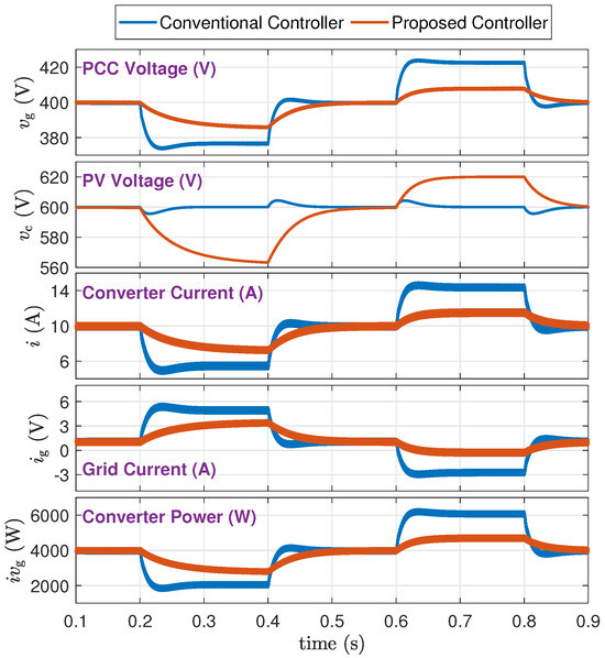 In this study, the solar irradiance of the PV array changes to half at s, returns to rated at s, doubles at s, and returns to rated at s. Two cases of strong and weak grid connections are simulated.