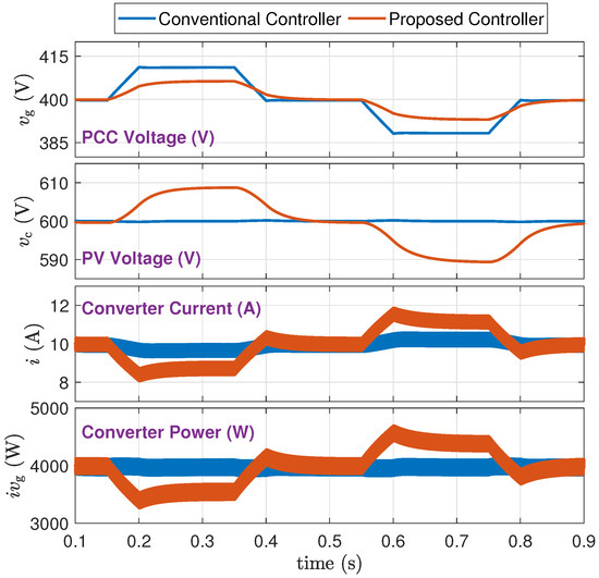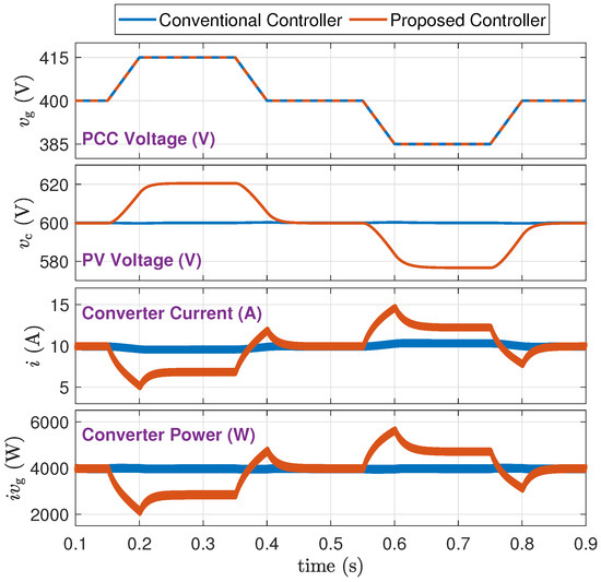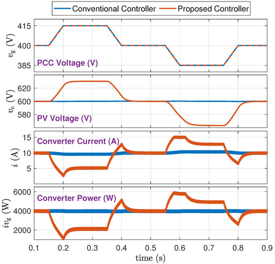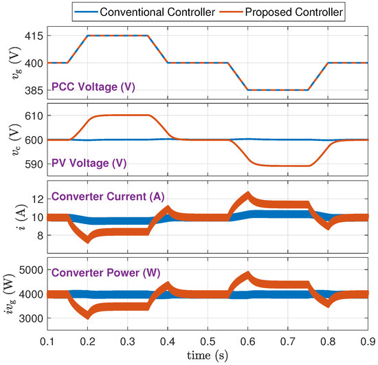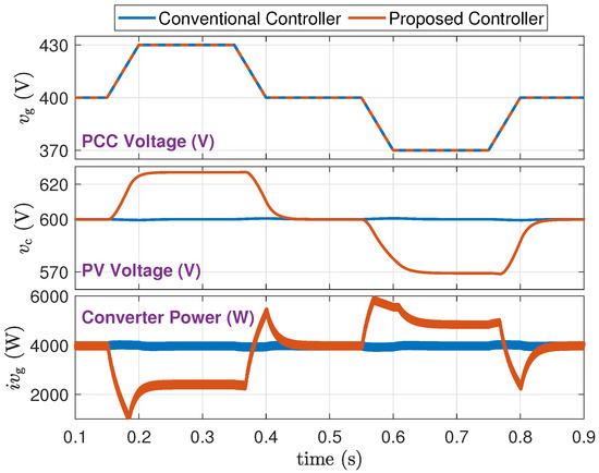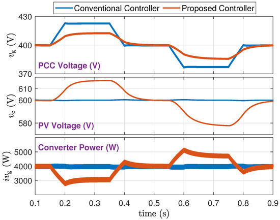 - From a trace of : The proposed method supports the grid voltage and maintains it within tighter limits. Specifically, when the PV power drops during 0.2 s to 0.4 s, the grid voltage drop is reduced from about 22 V to about 12 V. When the PV power increases from 0.6 s to 0.8 s, the grid voltage rise is reduced from about 22 V to about 7 V.