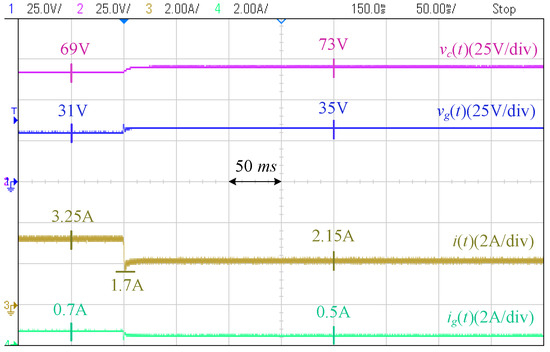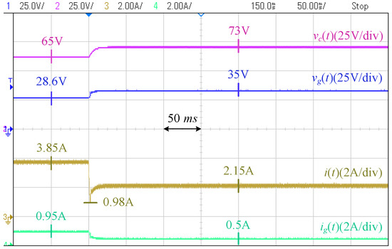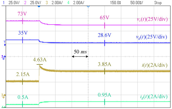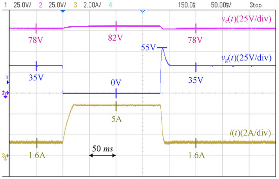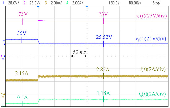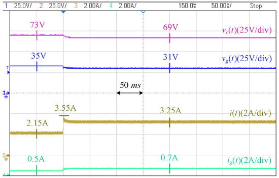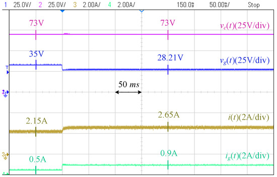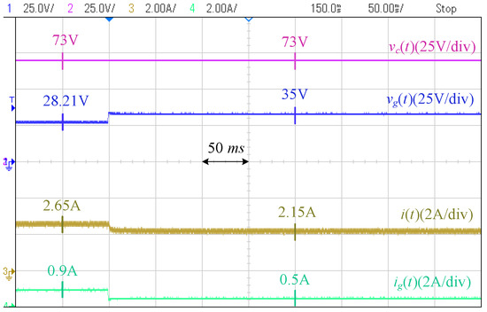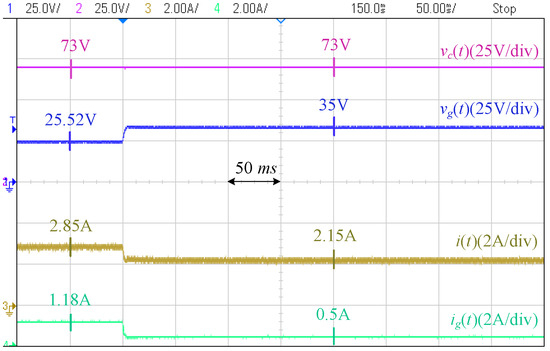 Figure 18 shows the photograph of the laboratory setup based on the circuit diagram of Figure 19. The system includes two modules of Agilent E4360A PV emulators (Agilent Technologies, Santa Clara, CA, USA) which one of them is used as the converter resource, and the other one is directly connected to the PCC through a resistor. The characteristics of the first PV emulator are as follows: Maximum voltage () is 65 V, open-circuit voltage () is V, maximum current () is A, and the short-circuit current () is A. The second PV emulator operates at its maximum power point and is utilized to generate disturbances on the PCC voltage. The grid is modeled by a voltage source in series with an impedance, where V, , and mH, to mimic a weak grid situation. A Chroma programmable electronic load 63802 is used as the local load initially adjusted at . The desired PCC voltage is 35 V.