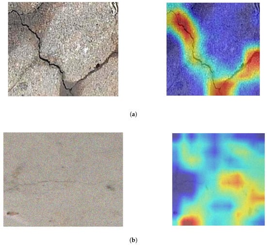 Figure 1. To demonstrate that our challenging samples are difficult for existing models to classify, we applied Grad-CAM to visualize ResNet50’s attention regions using weights pre-trained on ImageNet. (a) compares a standard crack image (left) with its corresponding heatmap (right), generated after fine-tuning the model with our task-specific parameters. (b) presents a challenging case where cracks are obscured by strong noise. The corresponding Grad-CAM heatmap (right) demonstrates severely scattered attention patterns, showing minimal alignment with the actual crack regions. This mislocalization directly compromises the model’s classification performance, highlighting its limitations in noisy environments.