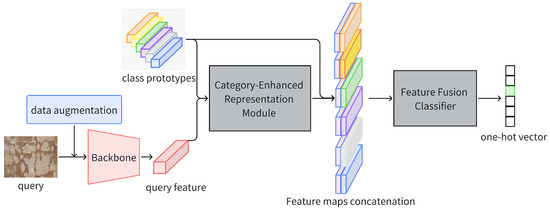 where ∏ denotes a combination of operations. Subsequently, the backbone extracts I as image features x q R H × W × C along with a prototype feature set P = { P c c = 1 , , K } R K × C × H × W into the CERM. The prototype vectors are utilized to enhance the query representation, producing an enhanced query feature x q p . The output of the CERM is an enhanced query set X q p = { x q p c c = 1 , , K } . Then, it is concatenated with the prototype feature set as a feature map F = Concat ( P , Q ) R ( 2 C ) × H × W . The FFC processes this feature map to fully integrate the information and calculate the relationship scores, which are ultimately used to classify the query x q to y q .