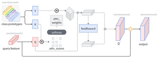 where d denotes the dimensionality of the features. This process generates attention scores that quantify the relevance of each prototype to the query, enabling the model to focus on category-specific features while suppressing irrelevant background information.