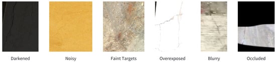 The training data D t r a i n consist of high-quality bridge defect images captured under controlled, normal conditions. These images provide a balanced representation of defect categories, enabling the model to learn robust feature representations. The test data D t e s t comprise hard samples specifically curated to simulate real-world acquisition challenges. These samples are artificially modified to include conditions such as reduced brightness, added noise, and simulated occlusions, ensuring that the test set reflects the variability encountered in practical inspections. Importantly, the training and test sets are mutually exclusive D t r a i n D t e s t = to ensure an unbiased evaluation of the model’s generalization capabilities.