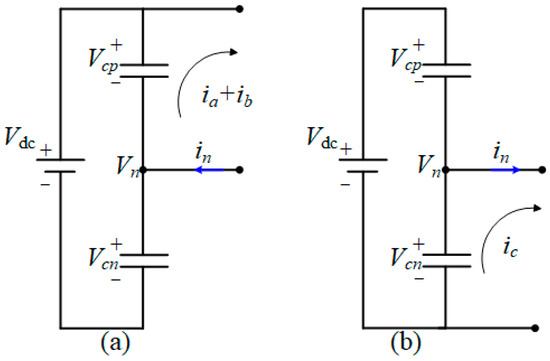 where and represent the currents flowing through capacitors and , respectively. Moreover, the neutral point current can be modeled as follows [25]: