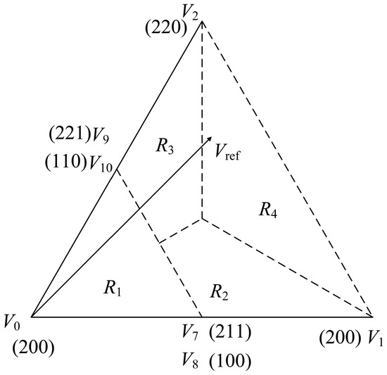 If RVV is situated in region , the voltage vectors , , and will be applied with duty cycles , , and , respectively. In this case, setting leads to the following relationships: