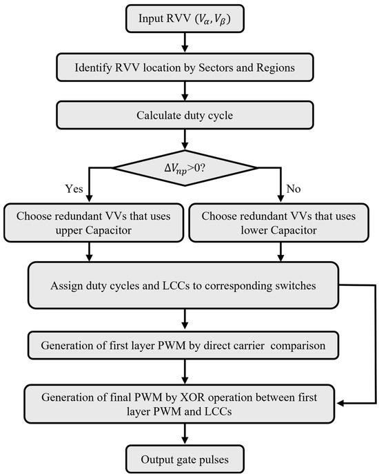 A flowchart of the proposed carrier-based implementation with XOR gates is presented in Figure 5. It generates PWM signals in two stages. The first stage involves comparing reference values and a subset of LCCs with the carrier. The LCCs follow a different comparison logic, and if the counter value exceeds the carrier, a ‘0’ is outputted. This ‘0’ is subsequently used in the XOR logic operation, which follows the logic operation principles , and .