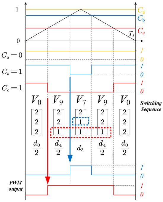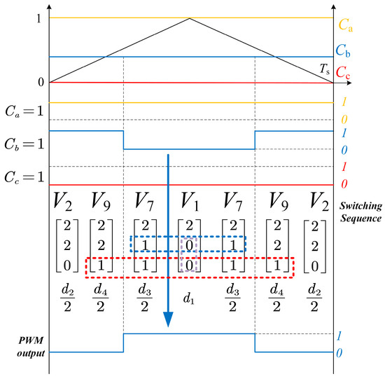 The duty cycle corresponds to the zero-voltage vector . The small voltage vectors and are assigned duty cycles and , respectively. Similarly, the large voltage vectors and are associated with duty cycles and . To ensure proper modulation, each duty cycle must remain within the range of 0 to 1, and their sum must always equal 1.