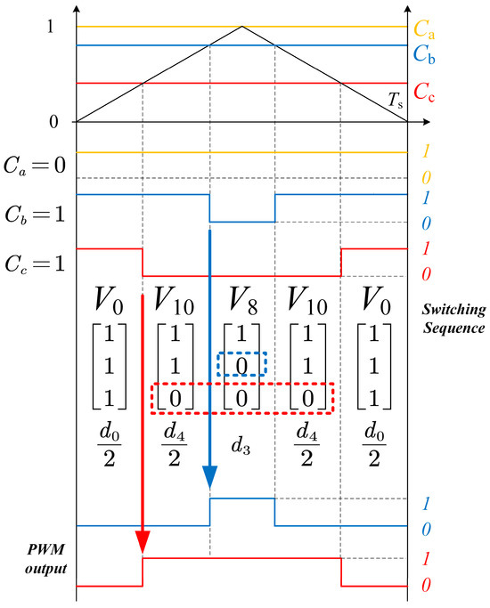 In , when is greater than zero, voltage vectors , and are selected. The inverter switching sequence is shown in Figure 8.