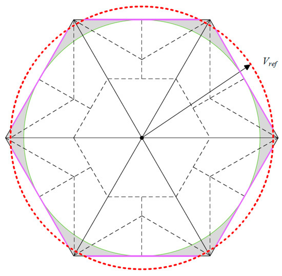 When the modulation index lies within the range of 0 to 0.866, the inverter operates in the linear modulation region. In this region, the RVV remains within the inscribed circle of the outer hexagon of the space vector diagram, as shown in Figure 10, and can be synthesized by the proposed method straight away. The outer hexagon boundary represents the theoretical limit of space vector modulation. The area between the inscribed circle and the hexagon boundary, which is shaded in grey in the figure, is not covered by linear modulation.