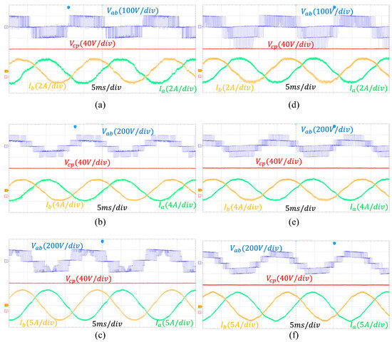 Experiment results of line voltage , capacitor voltage , line currents and , with modulation index at (a,d) m = 0.3, (b,e) m = 0.5, (c,f) m = 0.866. Left hand side: (a–c) 3L-SNPC inverter results. Right hand side: (d–f) 3L-NPC inverter results.