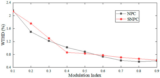 As the modulation index increases, the influence of harmonics diminishes, and the WTHD of the 3L-SNPC inverter shows a reduction of 0.15% and 0.06% compared to the 3L-NPC inverter.