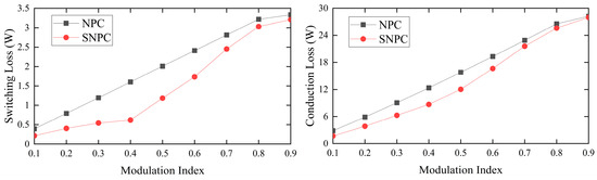 Switching and conduction loss comparison for the 3L-SNPC and the 3L-NPC inverter under the proposed method.