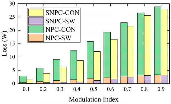 Total loss comparison with switching loss and conduction loss for the 3L-SNPC and the 3L-NPC inverter under the proposed method.