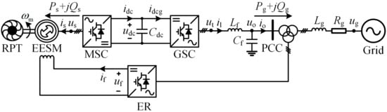 Schematic diagram of the FSC-VSPSU topology, illustrating the interaction between the RPT, EESM, MSC, GSC, ER, and the grid.