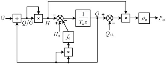 The hydraulic turbine model obtained from the aforementioned equations is shown in Figure 2, where Q, G, , and H are the water flow, gate opening, static head, and net head, respectively. represents the mechanical power output of RPT; is the water starting time of the penstock; is the frictional coefficient; L is the length of the penstock; A is the cross-section area of the penstock; g is the gravitational acceleration; is the constant value to convert from hydraulic turbine based value into the EESM base. The subscripts ‘n’ and ‘nL’ denote the nominal and the no-load values, respectively.