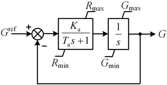 It can be observed that the servo system consists of two components []. The first-order inertia element represents the pilot servomotor, which is primarily used to control the rate of gate opening and closing. The subsequent integral element represents the gate servomotor, which is responsible for controlling the position of the gate opening. Since water is a nearly incompressible fluid, excessively rapid gate movements can generate pressure that may cause the penstock to rupture. Therefore, in addition to the limitations on the gate opening, the rate of gate movement must also be restricted. Furthermore, the actual gate opening generated by the servo system needs to be fed back negatively to the gate-opening reference to achieve zero steady-state error. Finally, the closed-loop transfer function of the servo system can be derived as follows: