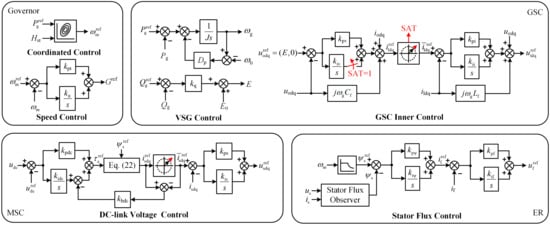 In generation mode, power priority control is recommended as the system-level control strategy due to its enhanced capability for rapid frequency and voltage support in power grids []. To achieve power priority control, the responsibilities of each control unit are assigned as follows: the governor is responsible for controlling the rotational speed to ensure unit stability; GSC is responsible for directly regulating the active power flow; MSC is responsible for controlling the DC-link voltage to facilitate power flow transfer; and ER is responsible for maintaining constant stator flux to prevent magnetic saturation. The complete control block diagram of the FSC-VSPSU is illustrated in Figure 4.