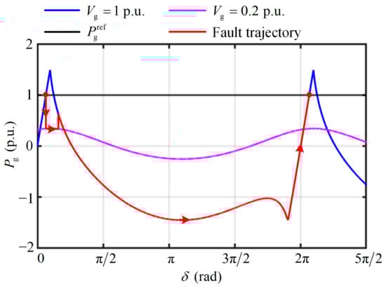 The power angle characteristic curves obtained with the circular current limiter during LVRT are illustrated in Figure 5 []. The figure depicts the power angle characteristic curves and fault ride-through trajectories under different grid voltage conditions. The blue line represents the power angle characteristic curve at = 1 p.u., the pink line corresponds to = 0.2 p.u., the black line indicates the constant power reference, and the red line illustrates the complete fault ride-through curve during the LVRT process.