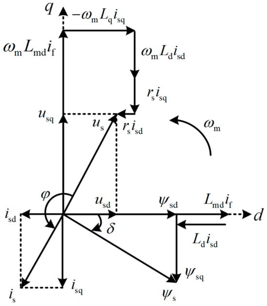where refers to the stator resistance; L refers to the synchronous reactance; refers to the armature reaction reactance; refers to the stator voltage; refers to the stator current; refers to the excitation current; refers to the stator flux; refers to the electromagnetic torque; refers to the power angle; and refers the power factor angle. The subscripts ‘d’ and ‘q’ represent the d-axis component and q-axis component, respectively. The phasor diagram of the EESM derived from the above equations is shown in Figure 6.