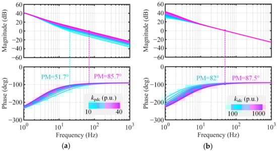It is evident that the effects of and on the system exhibit distinct characteristics. primarily influences the system gain in the high-frequency range. Increasing shifts the gain crossover frequency to higher frequencies, thereby enhancing the phase margin, improving system stability, and reducing overshoot. As shown in Figure 8a, when = 10 p.u., the phase margin is approximately 51.7°, whereas increasing to 40 p.u. results in a phase margin of 85.7°. Notably, the low-frequency gain remains unaffected, ensuring that the system’s response speed remains relatively consistent. Conversely, predominantly affects the low-frequency gain of the system. As increases, the low-frequency gain rises, indicating an expansion of the system’s bandwidth and a corresponding increase in response speed. However, variations in do not significantly alter the gain crossover frequency, leaving the phase margin largely unchanged. From Figure 8b, it can be observed that when = 100 p.u., the phase margin is 82°, and when = 1000 p.u., the phase margin increases marginally to 87.5°, representing a mere 5.5° improvement. In conclusion, increasing effectively reduces system overshoot, while increasing enhances the response speed.