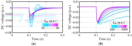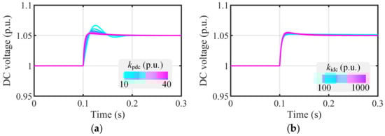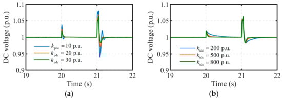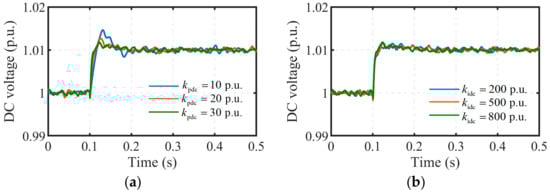 Simulation results of the step response of the DC-link voltage under different controller parameters: (a) The values of are set to 10 p.u., 20 p.u., and 30 p.u., respectively. (b) The values of are set to 200 p.u., 500 p.u., and 800 p.u., respectively.