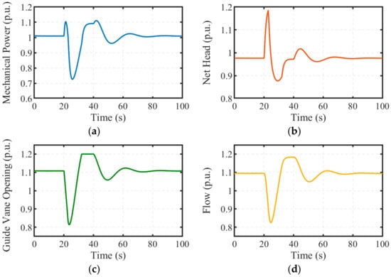 Simulation results of hydraulic system: (a) Mechanical power. (b) Net head. (c) Gate opening. (d) Water flow.