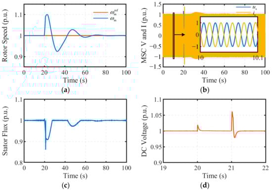 Simulation results of MSC: (a) Rotor speed. (b) Stator voltage and current. (c) Stator flux magnitude. (d) DC-link voltage.