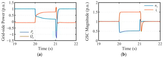 The simulation results of the GSC are shown in Figure 14. When a sudden grid voltage dip occurs, the circular current limiter promptly activates to restrict the grid-side converter current to its maximum allowable value. Simultaneously, the reference values of the APC and RPC loops are adjusted accordingly. The reactive power rapidly increases to support grid voltage recovery, while the active power decreases to ensure sufficient reactive power compensation. Upon grid voltage recovery, the active power exhibits a reverse absorption effect before returning to the pre-fault operating point, which aligns with the theoretical analysis presented in Section 3.2.2. The entire fault recovery process is completed within approximately 0.2 s. Notably, due to the presence of grid impedance, even when the grid voltage drops to 0.2 p.u., the PCC voltage does not decrease to 0.2 p.u., remaining at approximately 0.5 p.u.