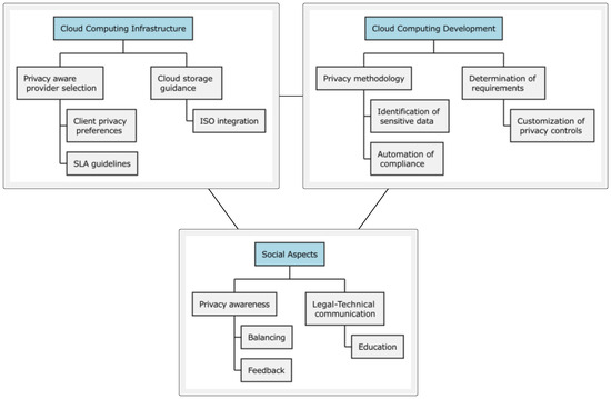 The software stage (Figure 3) is dedicated to the technical implementation of privacy mechanisms, addressing developers’ needs and technical requirements to achieve effective integration. Developers encounter significant challenges in embedding privacy into cloud services, especially when accounting for social factors [34,35]. Key considerations include adopting privacy-by-design practices and adapting to shifting privacy demands. Balancing ease of use with strong privacy protections, managing complex data flows in distributed cloud services, and ensuring regulatory compliance are central concerns in this area [28,36].