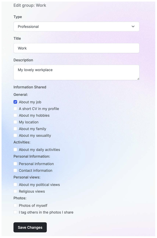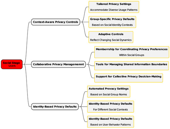 The social layer (Figure 2) focuses on incorporating users’ social contexts into privacy frameworks. It targets two key areas: understanding user contexts and defining social requirements. By acknowledging the social aspects of privacy, this layer fosters the creation of adaptive, user-focused privacy solutions. Research findings showed that privacy preferences differ significantly among social groups, highlighting distinct privacy management behaviors within these groups [29,30].