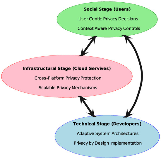 The three-stage framework for self-adaptive privacy operates as an interconnected system in which the social, technical, and infrastructure stages dynamically interact to create a comprehensive and adaptive privacy management approach. Each stage plays a distinct role while simultaneously influencing and reinforcing the others, ensuring that privacy measures align with both user needs and technological capabilities, see Figure 5.