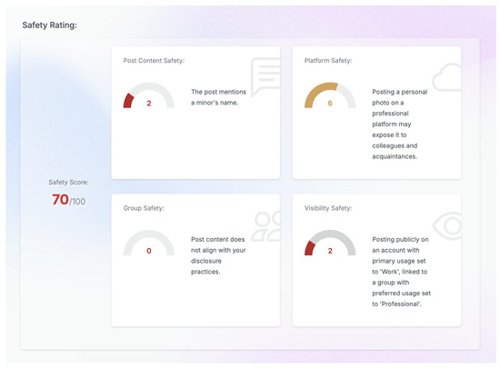 A key contribution of this study lies in the integration of AI capabilities within self-adaptive privacy management. The recommendation engine’s ability to process diverse data types—including textual, visual, and multimodal inputs—demonstrates the potential of AI in enhancing privacy decision-making. This aligns with emerging trends in AI-driven privacy research, such as [17] who proposed PriMonitor for adaptive privacy preservation in multimodal emotion detection. However, unlike PriMonitor, which primarily focuses on data modality protection, our approach integrates a broader spectrum of privacy considerations, offering users contextualized recommendations that extend beyond data security to encompass content sharing strategies and platform selection. The introduction of a safety scoring system (0–100) further enhances user empowerment by providing clear, actionable insights into the privacy implications of their online interactions.
