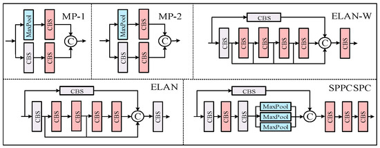 The input, the backbone network, and the head structure are the three main parts of the YOLOv7 detection model. As shown in Figure 1, the input consists of three-channel images at a resolution of 640 × 640 pixels. The backbone network includes convolutional layers, the ELAN module [18], and the MP module. The ELAN module is designed for feature extraction and channel control, enabling the network to learn a wider range of features. The head structure consists of the SPPC-SPC module, the PAFP structure, and the output layer. This configuration facilitates feature fusion by combining high-level and low-level feature maps, followed by further feature extraction and final prediction output of the processed feature maps.