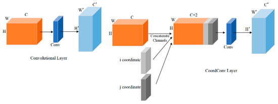 Traditional convolution and coordinate convolution, where the left side is the traditional convolution layer and the right side represents the coordinate convolution layer.