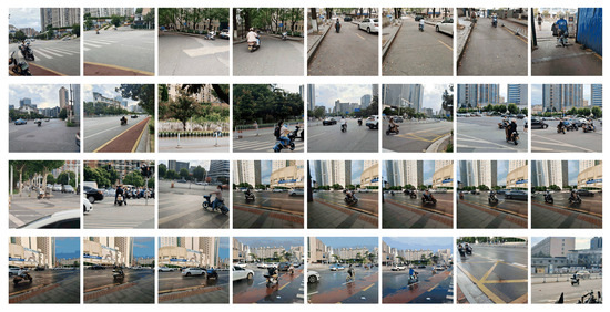 To address the current lack of a dataset for electric vehicle driver helmets and the need for diverse scenario representation, real-life images of electric vehicle helmets were collected and compiled into a custom dataset for helmet-wearing detection. This dataset serves as the foundation for comparative and ablation experiments in training and testing. The images were gathered from various traffic scenarios in Changsha, Hunan Province, covering non-peak and peak commuting times, as well as urban and suburban road sections. This diversity ensures the model’s robustness and applicability in real-world settings. The images were captured using a phone with an original pixel size of 3120 × 3120, resized to 640 × 640 for consistency. A subset of experimental dataset samples is illustrated in Figure 6.