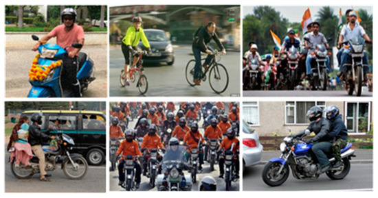 - Dahiya, K.; Singh, D.; Mohan, C.K. Automatic detection of bike-riders without helmet using surveillance videos in real-time. In Proceedings of the 2016 International Joint Conference on Neural Networks (IJCNN), Vancouver, BC, Canada, 24–29 July 2016; IEEE: Piscataway, NJ, USA, 2016; pp. 3046–3051. [Google Scholar]