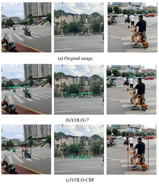 Visual comparison: (a) the original image, (b) the detection result of YOLOv7, and (c) the detection result of the YOLO-CBF model.