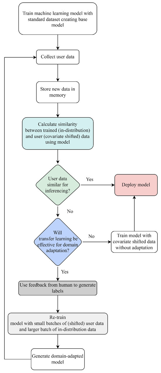- The next step is a checkpoint to test if transfer learning would be effective for domain adaptation. The similarity score obtained in step 2 is used again. If the covariate-shifted dataset is similar to the in-distribution data, then iterative re-training can be used. If the datasets are very dissimilar, then instead of transfer learning the model should be trained from scratch and the new model deployed. Such a case may indicate a significant shift in the domain data, and either the new data needs to be rejected or the model needs to be changed.